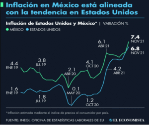 En México, la segunda economía de la región, la inflación registró un alza interanual de 7,37 % en noviembre, el mayor nivel en dos décadas, ante el alza de insumos básicos como los agropecuarios y la energía. México es el quinto país con mayor aumento de precios, la inflación registrada en el país solo es superada por Argentina, Turquía, Brasil y Rusia.